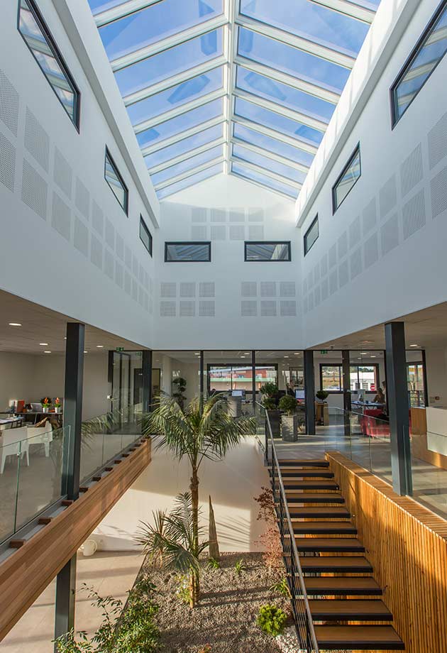 The purpose of the skylight was to bring natural light into the building, whilst meeting a number of requirements: providing natural ventilation in summer and thermal insulation in winter; effective soundproofing to ensure a high quality office working space and, finally, a quick and easy installation.