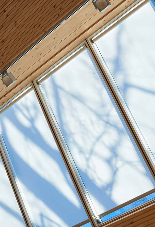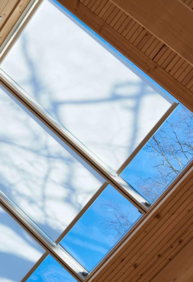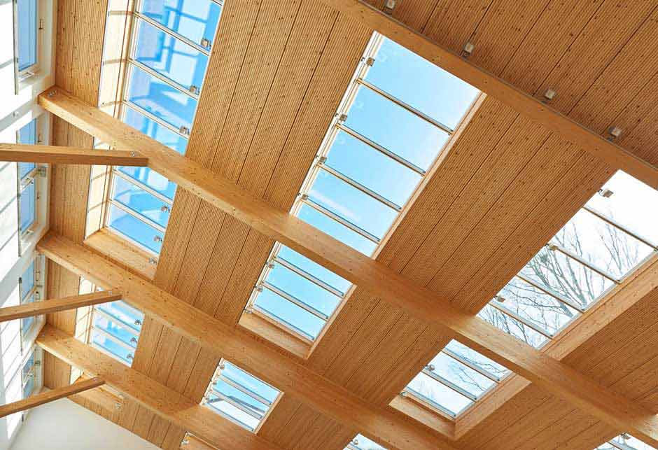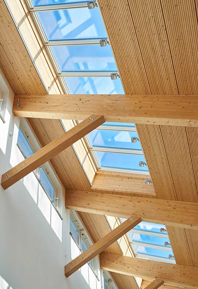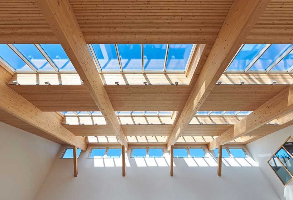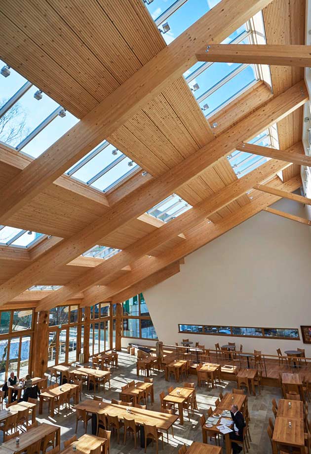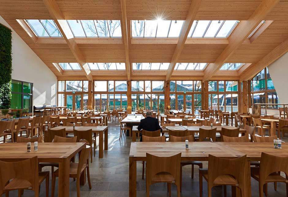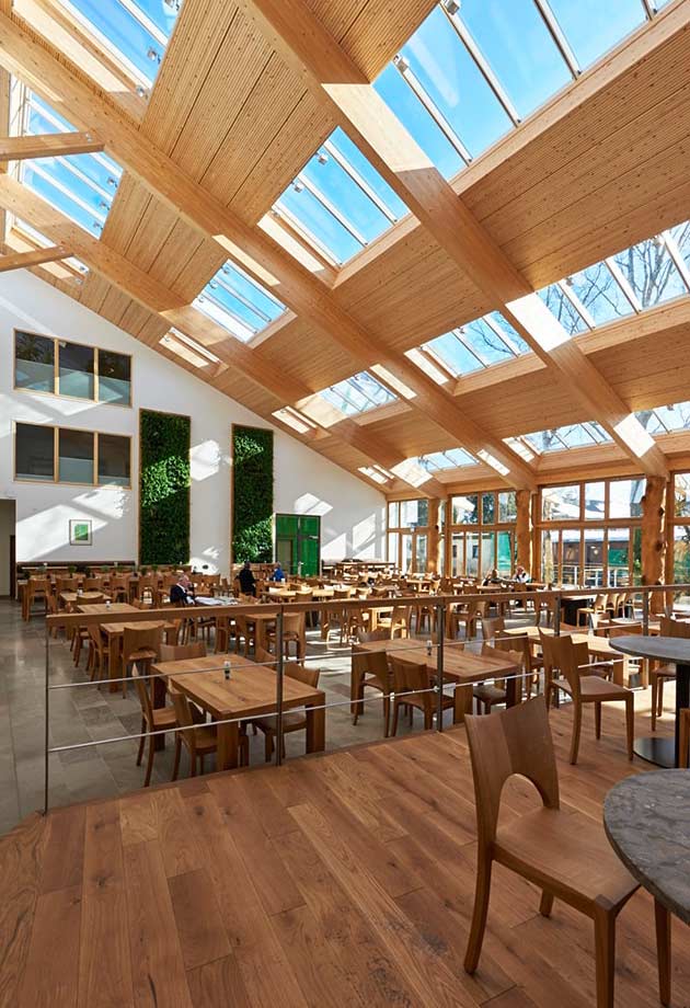 Four Longlights, comprising 64 VELUX Modular Skylights, integrated into the striking pent roof, provide plenty of daylight and create a relaxing and comfortable atmosphere. A clever combination of visual references to the outside space and the incidence of light from above ensures a sense of openness and maximum brightness in the employee canteen.